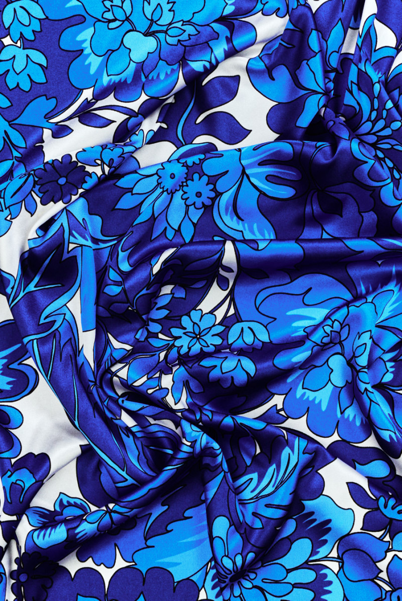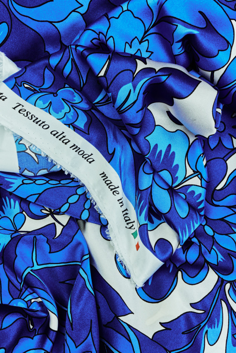 Itāļu zīda satīns ar elastāna pievienošanu ar lielu, rudzupuķu zilu augu motīvu uz balta fona. Blīvs modelis spilgtās krāsās, kas attēlo ziedus un lapas, lielākais zieds ir 23 cm * 22 cm un lapa ir 20 cm * 32 cm. Audums ir elastīgs, plūstošs, maigs uz tausti, mīksts un necaurspīdīgs. Fantastisks piedāvājums, no kura jūs varat izveidot gaisīgas kleitas, svārkus, kā arī kreklus, blūzes vai šalles.