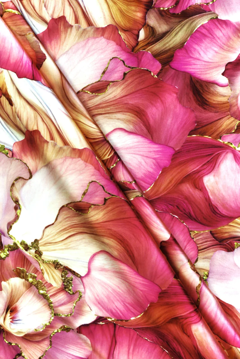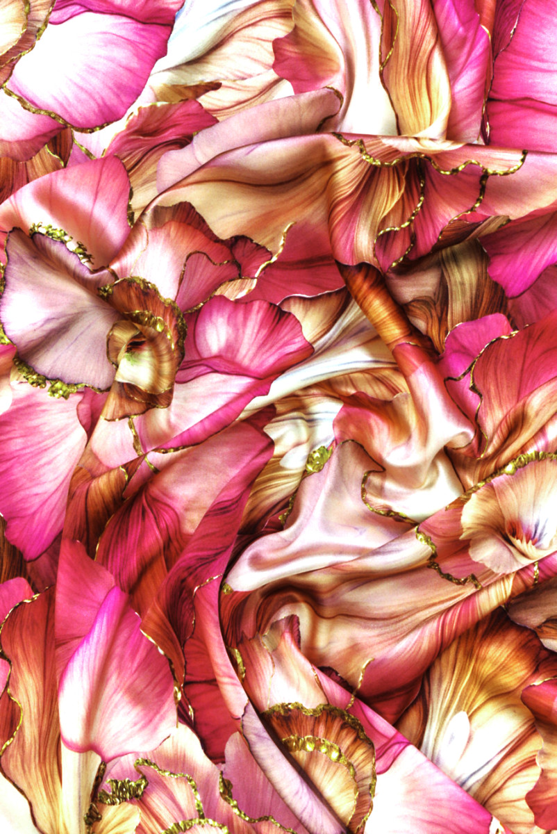 Itāļu zīda satīns ar elastāna pievienošanu, ar lielu, krāsotu ziedu motīvu koraļļu un rozā toņos. Ziedu, blīvs modelis, kurā daži ziedi ir pabeigti ar zelta krāsas kontūru, pateicoties kurai viss iegūst spilgtu un unikālu izskatu. Audums ir plūstošs, elastīgs, necaurspīdīgs un mīksts. Priekšlikums, ko mēs īpaši iesakām gaisīgām kleitām un svārkiem, būs lieliski piemērots arī blūzēm un krekliem.