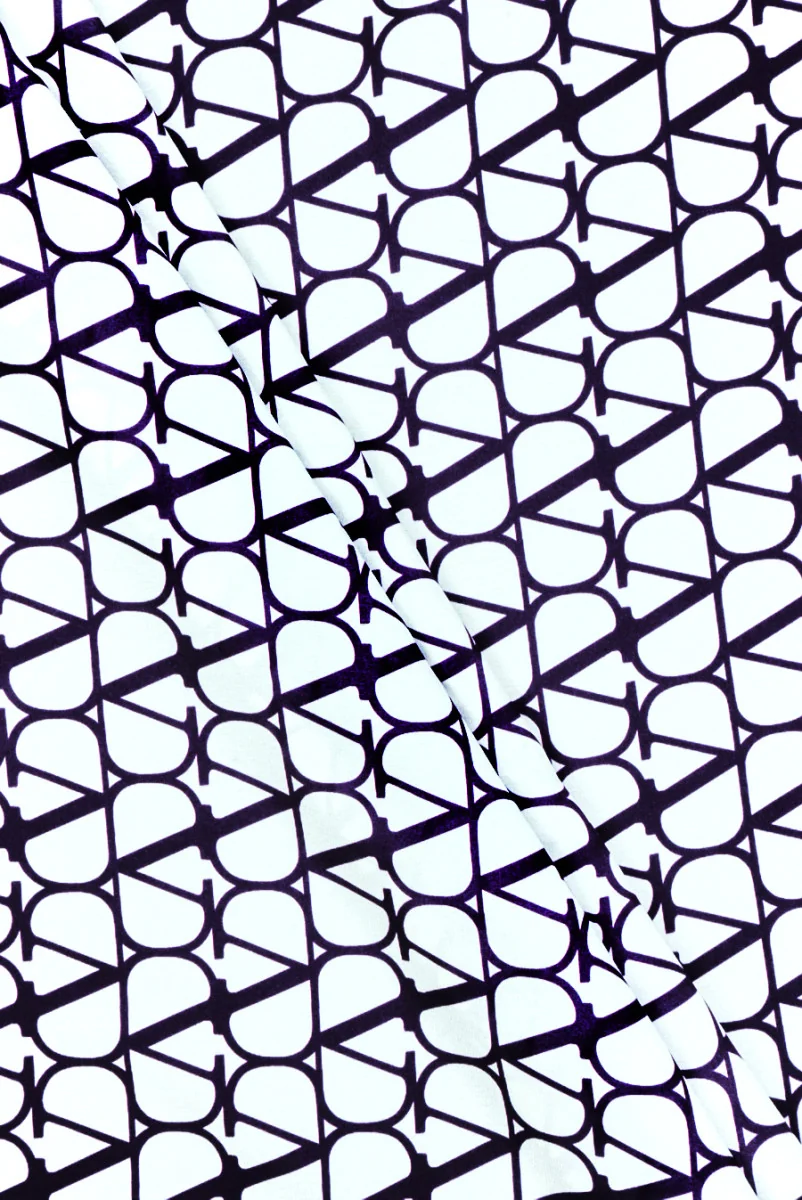 Itāļu zīda satīns ar elastāna pievienošanu ar tumši violeta V motīvu, kas sakārtots rindās uz balta fona. Regulārs, blīvs raksts, kas uzdrukāts auduma kreisajā, matētajā pusē, viens burts ir 3 cm augsts un ievietots nepilnīgā ovālā. Audums ir viegls, plūstošs, elastīgs, plāns un diezgan necaurspīdīgs. Interesants piedāvājums, no kura jūs varat izveidot oriģinālus kreklus, blūzes, kā arī kleitas un svārkus, kuriem mēs iesakām izmantot oderi.
