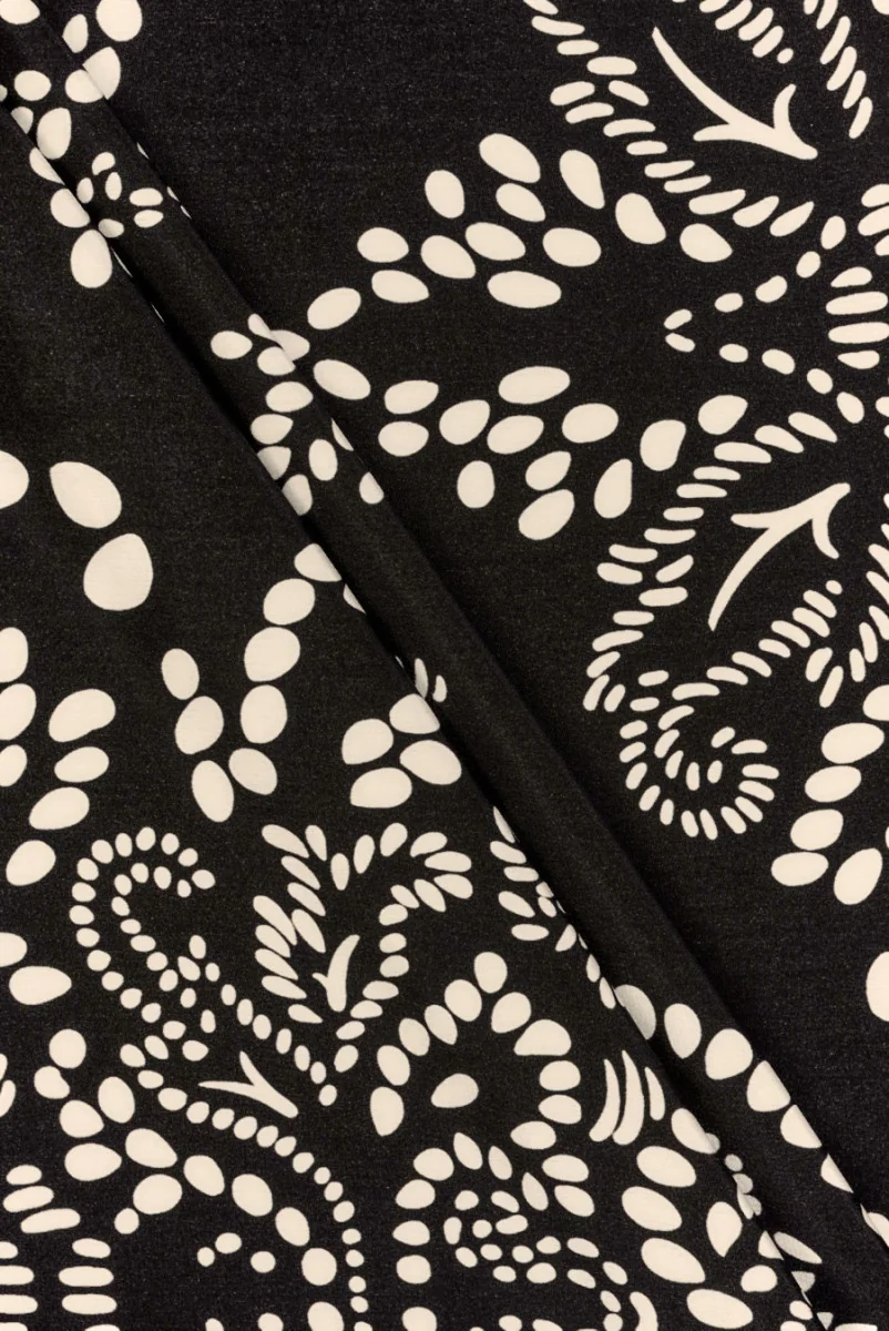 Itāļu kreps 100% zīds ar mazu, smilškrāsas punktu motīvu, kas sakārtoti ļoti lielos, austrumu rakstos. Raksts ir regulārs un novietots uz melna fona 125 cm platumā, viena auduma mala ir pabeigta ar gludu, melnu apmales svārku 15 cm platumā. Viens un atkārtots motīvs ir 50 cm plats un 80 cm garš. Audums ir plāns, viegls, gaisīgs, mīksts un neelastīgs. Unikāls piedāvājums tiem, kas meklē elegantus materiālus. Ideāli piemērots kleitām, svārkiem, blūzēm un krekliem.