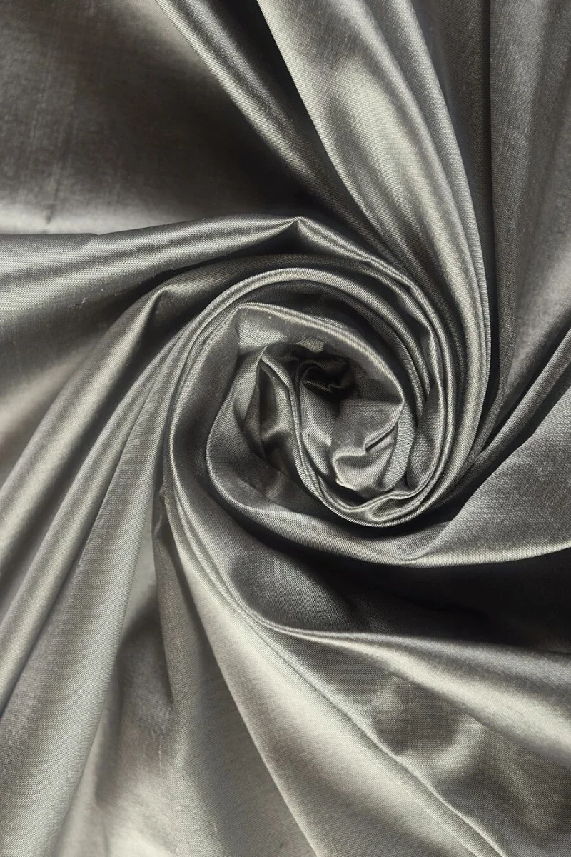 Itāļu 100% zīda shandung audums, austs no divu krāsu diegiem: melnbalts, kas rada divu toņu efektu. Audums ir gludāks ar nelieliem sabiezējumiem. Tas ir necaurspīdīgs, neelastīgs, diezgan stingrs un ļoti elegants. Tas ir ideāli piemērots vakarkleitām, svārkiem, blūzēm un jakām.
