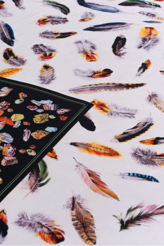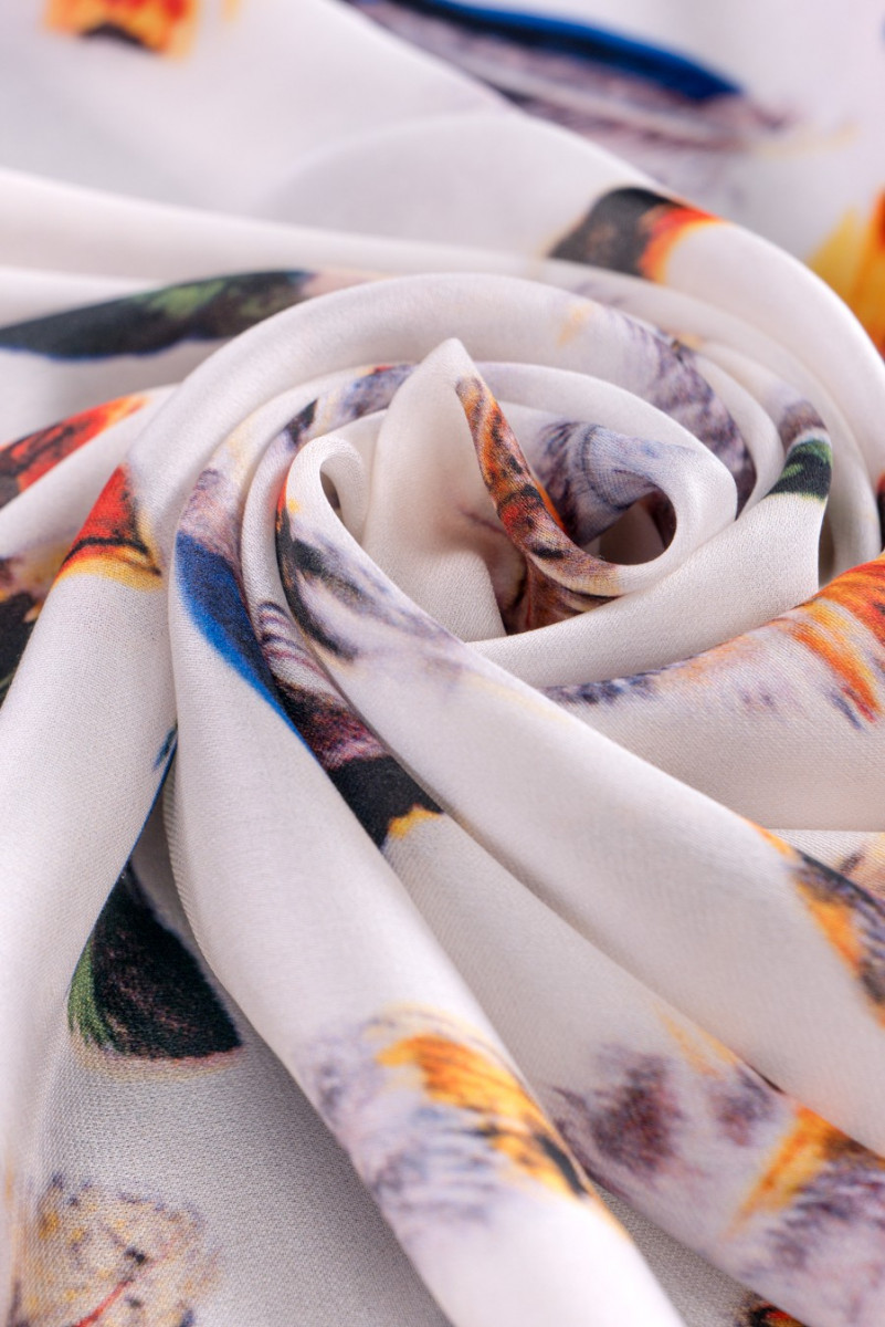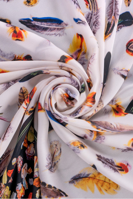 Gaisīgs, biezs muslīns no dabīgā zīda, kas austs atkārtotos rakstos - kuponi ar izmēru 140*70 cm. Kupons sastāv no 2 melniem kvadrātiem ar dārgakmeņu apdruku vidū ar malām 32 cm * 32 cm. Kvadrātus ieskauj krāsainas spalvas uz écru fona. Audums ir maigs, gaisīgs, daļēji caurspīdīgs. Mēs iesakām to interesanti. oriģinālas blūzes, tunikas, kleitas vai šalles.