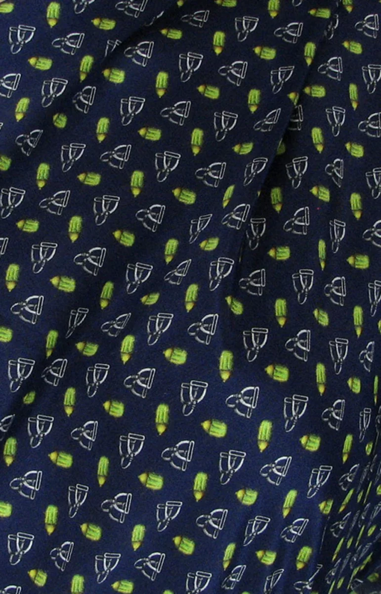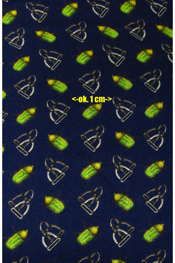 Navy zilā zīda kreps ar regulāru vaboļu un kāpšļu rakstu ir smalks, plāns, bet necaurspīdīgs, pusmatēts audums. To var izmantot, lai uzburtu gaisīgas kleitas, smalkas blūzes, šalles, šalles.