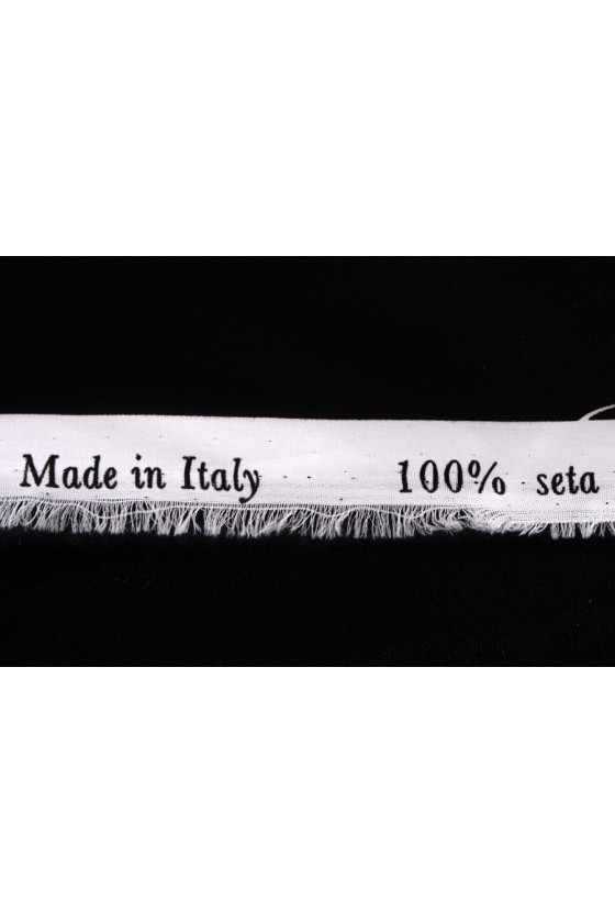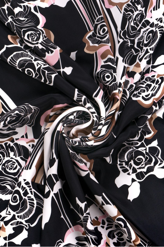 Itāļu 100% zīda satīns melnā krāsā ar blīvu rožu ziedu apdruku baltā, bēšā un gaiši rozā krāsā. Visu papildina plašas, viļņotas svītras tajās pašās krāsās. Fantastisks piedāvājums cilvēkiem, kuriem patīk ziedu raksti tumšās krāsās.