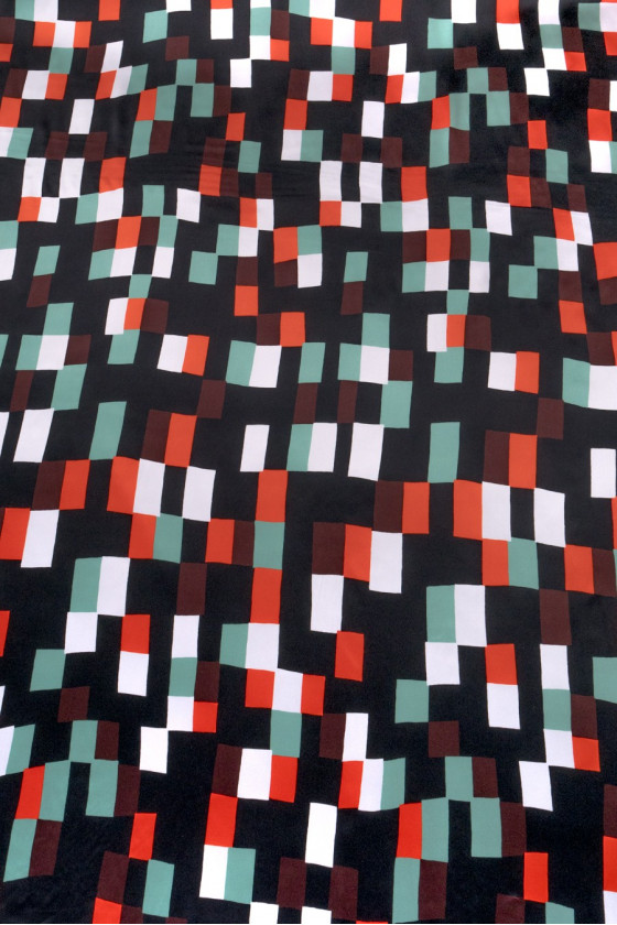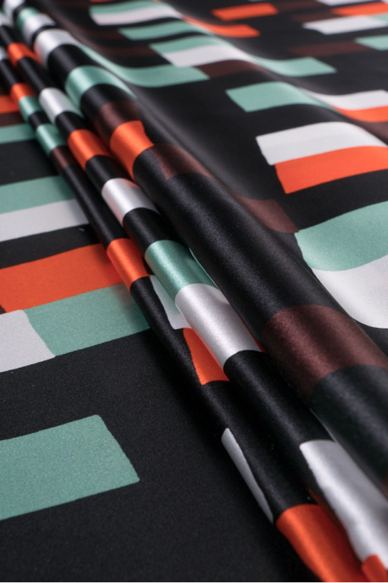 Skaists rakstains satīns, ko no dabīgā zīda izgatavojis pazīstams modes dizainers. Krāsas: krāsaini taisnstūri (balts, piparmētru un oranžs) uz melna fona