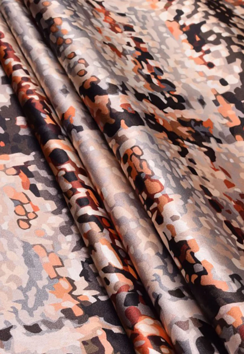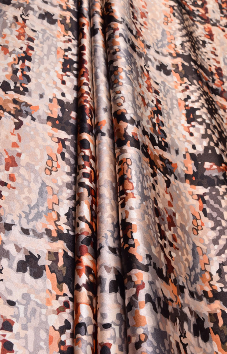 Zīda satīns lielā čeku apdrukā ir smalks audums, samtains uz tausti, ar maigu spīdumu. To var izmantot, lai uzburtu gaisīgas kleitas, smalkas blūzes, šalles, šalles.