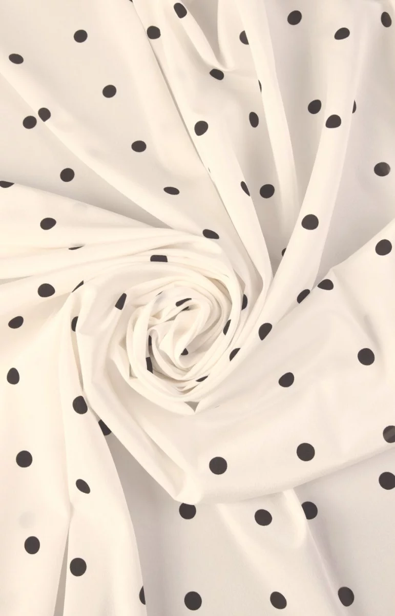 Polka punktveida zīda kreps ir smalks, plāns, bet daļēji necaurspīdīgs audums ar nelielu spīdumu. To var izmantot, lai uzburtu gaisīgas kleitas, smalkas blūzes, šalles, šalles. Mēs iesakām izvēlēties oderi. Krāsas: melni punkti uz ecru.