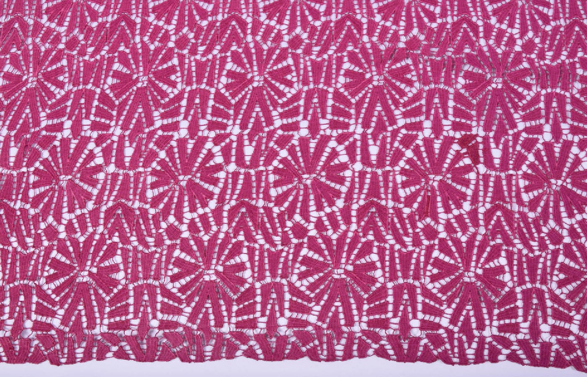 Italian guipure fabric in amaranth colour in coupons with dimensions of 110 cm* 90 cm and 70 cm* 90 cm. A beautiful, dense floral pattern connected by a spider's web, the fabric is finished on both sides with a small, decorative tooth. The fabric is perfect for people who like muted colors. It is perfect for sewing an elegant dress, blouse, skirt or as a finishing touch to other fabrics.
