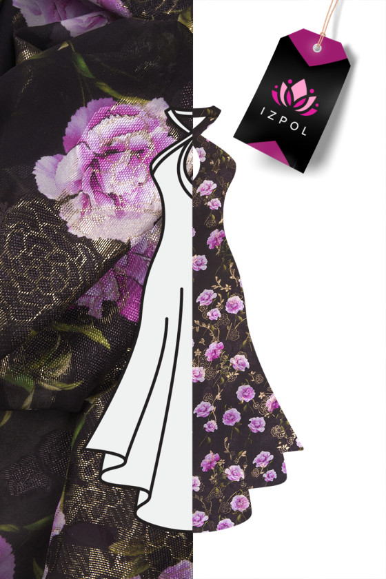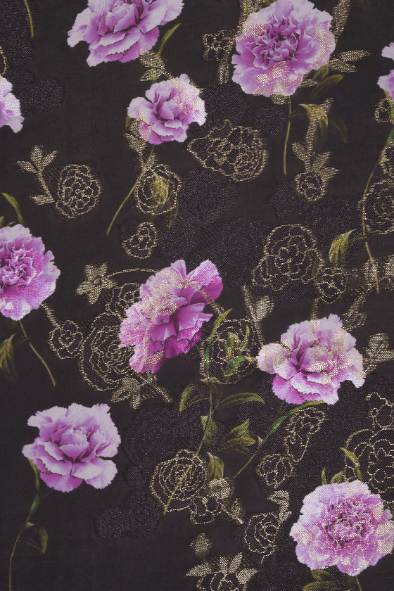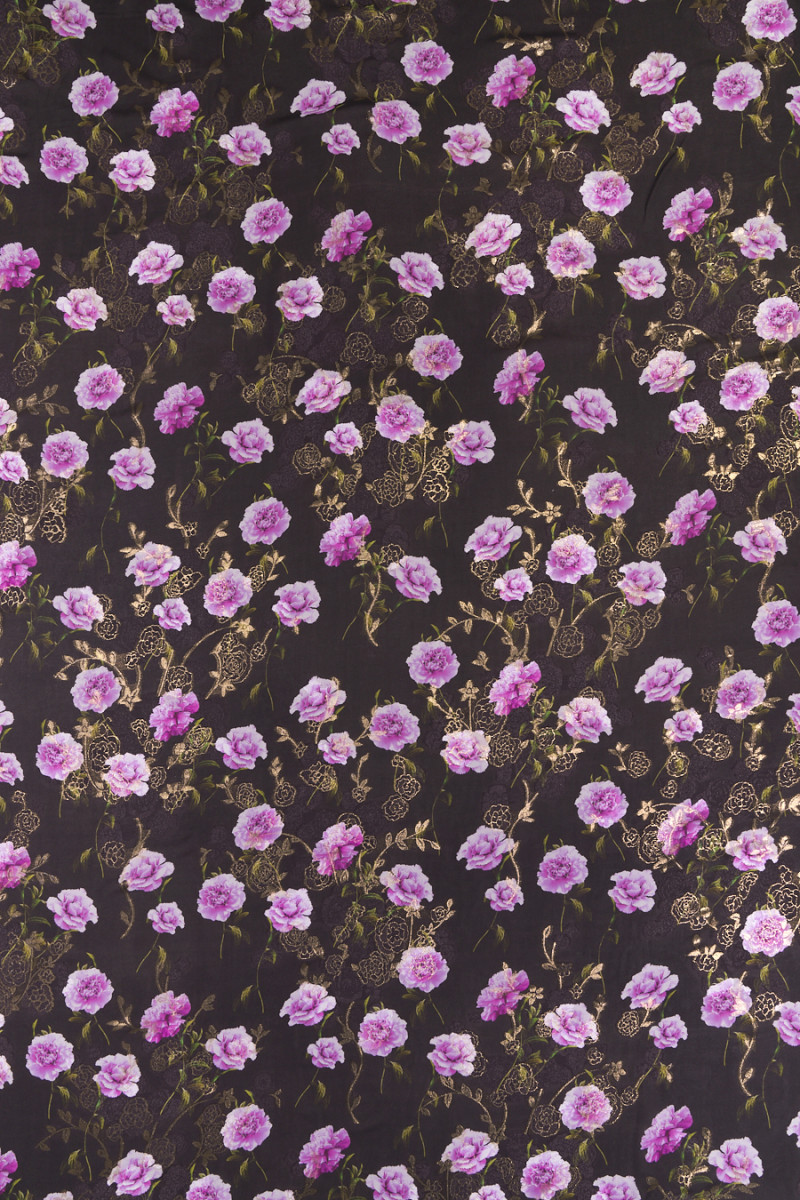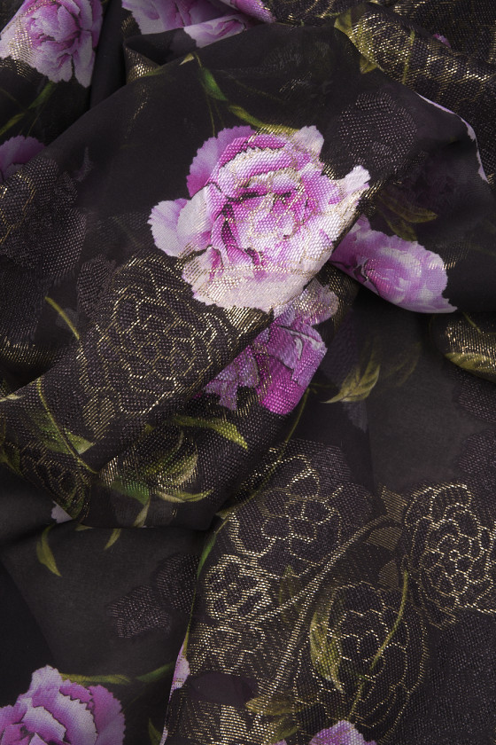 Italian muslin 100% silk in black with a motif of pink flowers and black and gold flowers and leaves woven in the devore technique. Devore fabric is a combination of smooth, transparent silk muslin with opaque, matte flowers and leaves decorated with lurex thread.