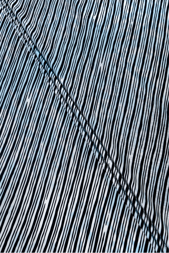 Talianska 100% hodvábna keprová tkanina s čiernymi, priečnymi pruhmi na tieňovanom pozadí v modrej a krémovej farbe. Látka je podpísaná názvom známeho módneho domu. Hodvábny kepr je tkanina s keprovou väzbou, mäkká, veľmi odolná, jemne tuhá. Perfektné na šitie košele, šiat, sukne alebo šálu/šatky.