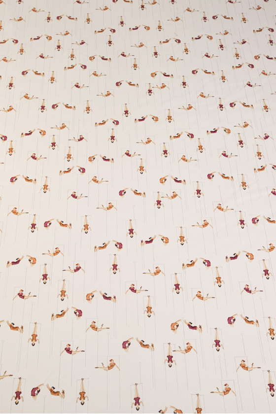 Elastické bavlnené ecru s originálnym vzorom akrobatov (množstvo figúrok asi 5 cm). Hmotnosť látky je ideálna na šaty, sukne, nohavice alebo na dekorácie