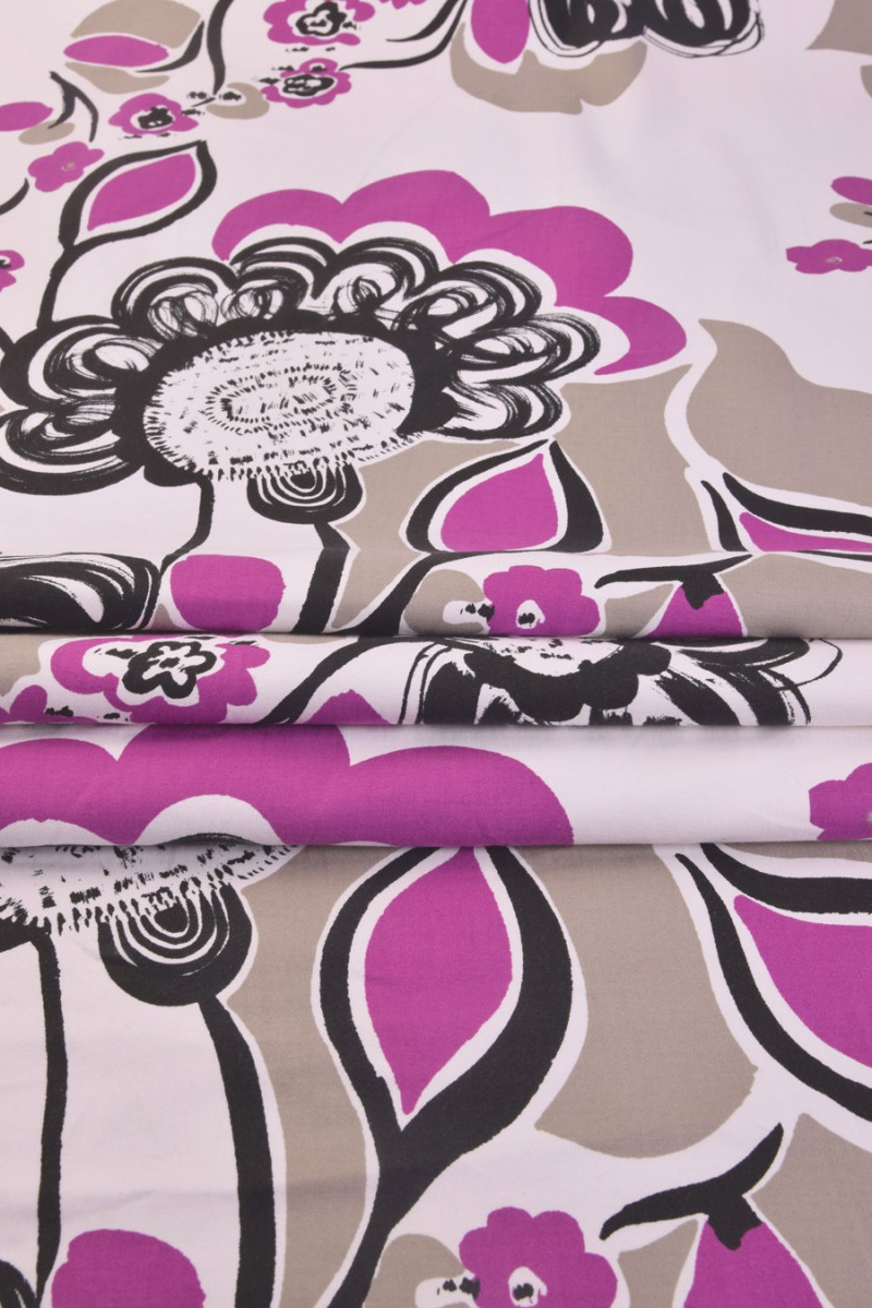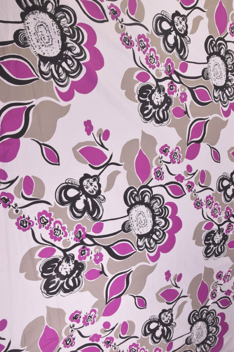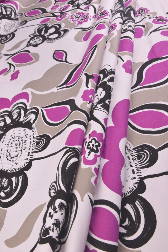 Bavlna s potlačou, elastická, hrubšia s veľkým, maľovaným vzorom kvetov. Farby: kvety vo fialovej, čiernej a olivovo béžovej farbe na ecru.