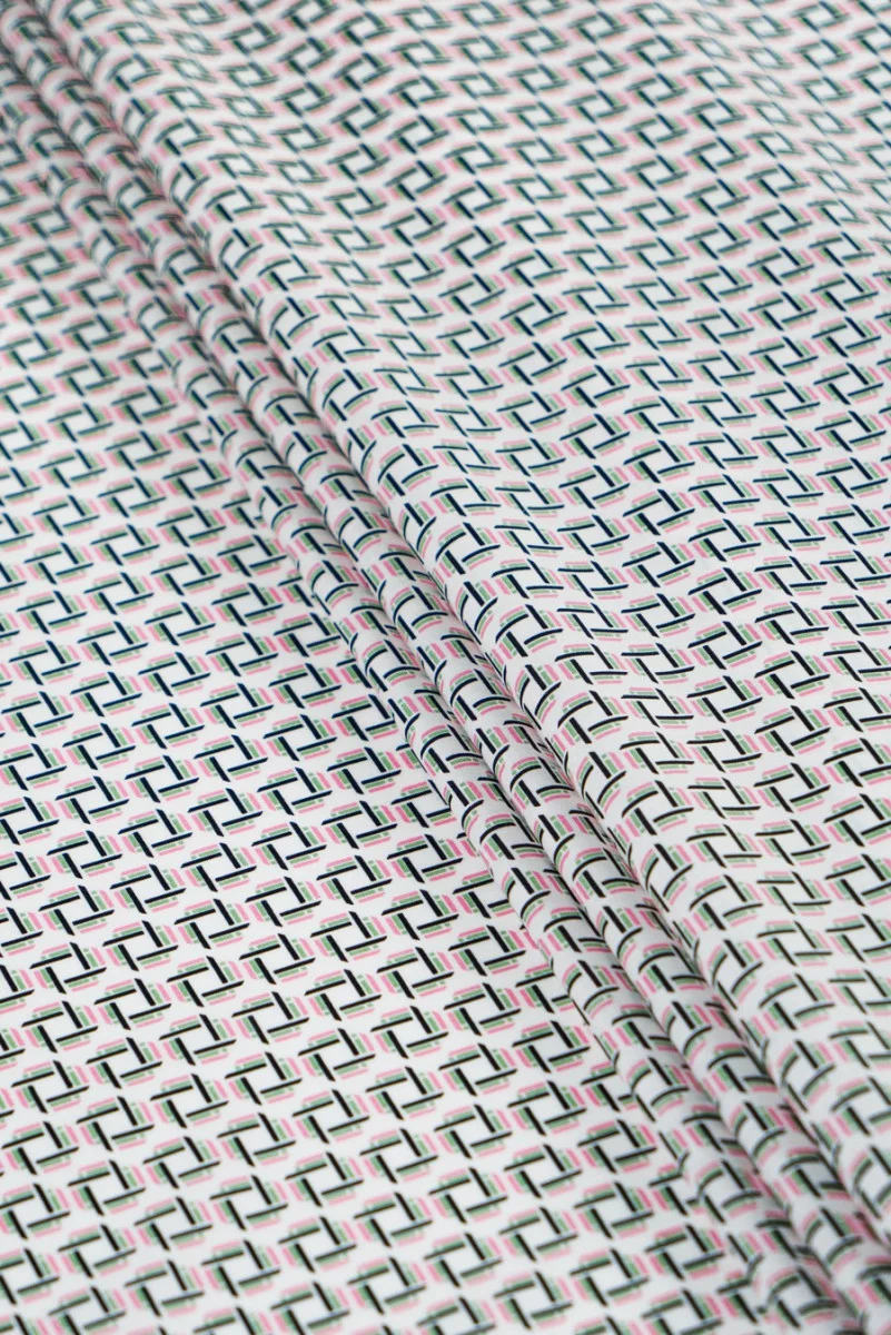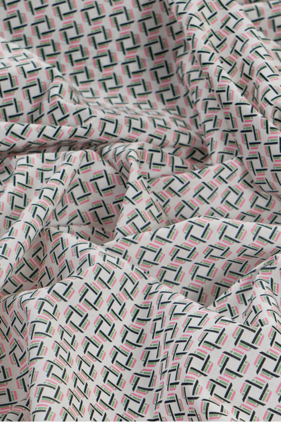 Talianska, elastická košeľa bavlnená s malým geometrickým vzorom (1,5 cm) v čiernej s ružovou a zelenou farbou na krémovom pozadí. Ideálne na šitie košele, blúzky, šiat.
