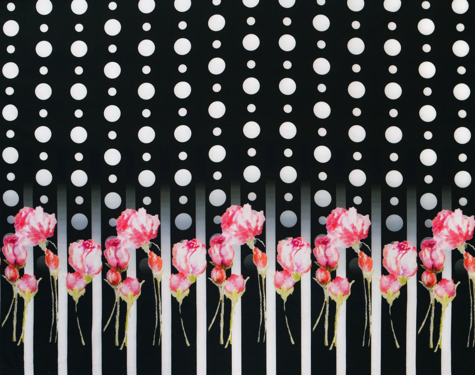 Talianska bavlna v kupóne s rozmermi 110 cm* 150 cm. Látka s veľmi zaujímavou žakárovou väzbou. Horná časť kupónu má motív veľkých bodiek (4,5 cm a 2 cm), spodná časť je maľovaná ružami na sivých a čiernych pruhoch. Elastická, mierne tuhá, matná tkanina - ideálna na šitie šiat alebo sukne.