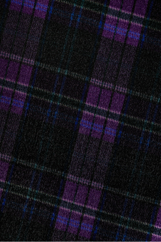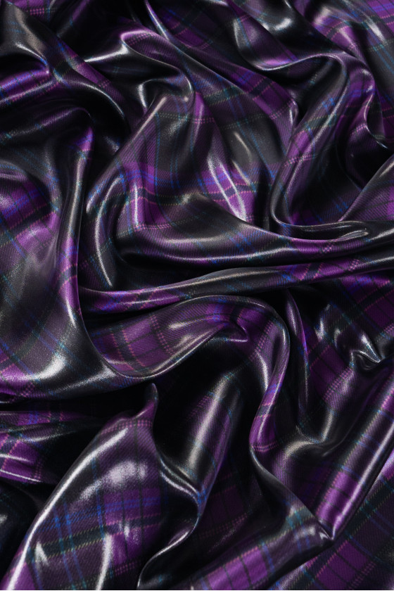 Talianska bavlnená tkanina s lesklým povlakom a trblietkami mokrého vzhľadu. Čierna látka s fialovo-zeleným károvaným motívom (5 cm). Tenká, mierne tuhá, neelastická tkanina - veľmi originálna.