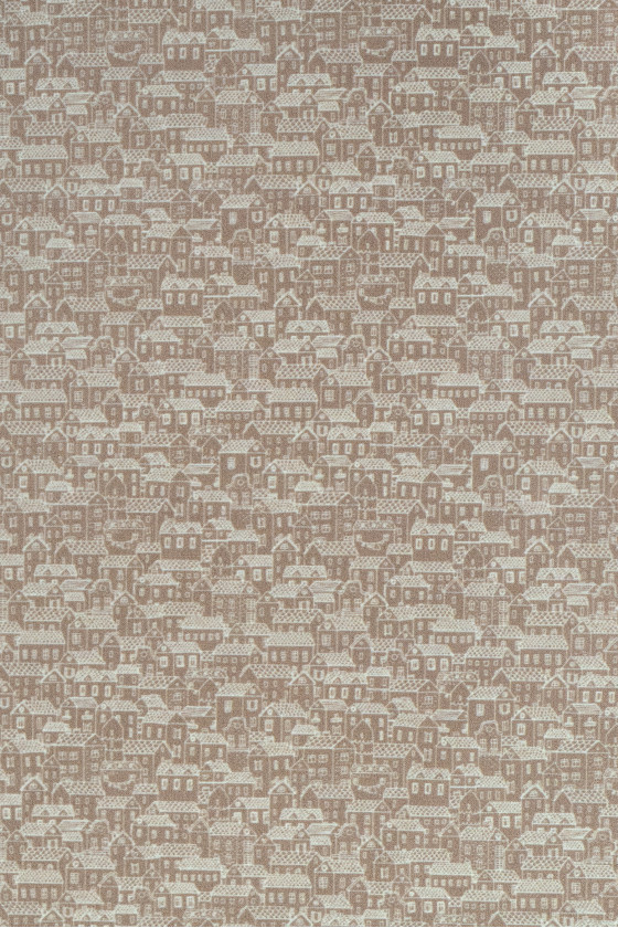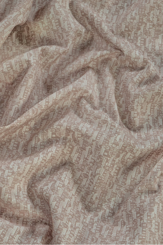 Talianska košeľa bavlnená v béžovej farbe s motívom malých domčekov. Neelastická tkanina so saténovou väzbou, nepriehľadná, malá záhyb. Ideálne na šitie košele, blúzky, šiat alebo sukne.