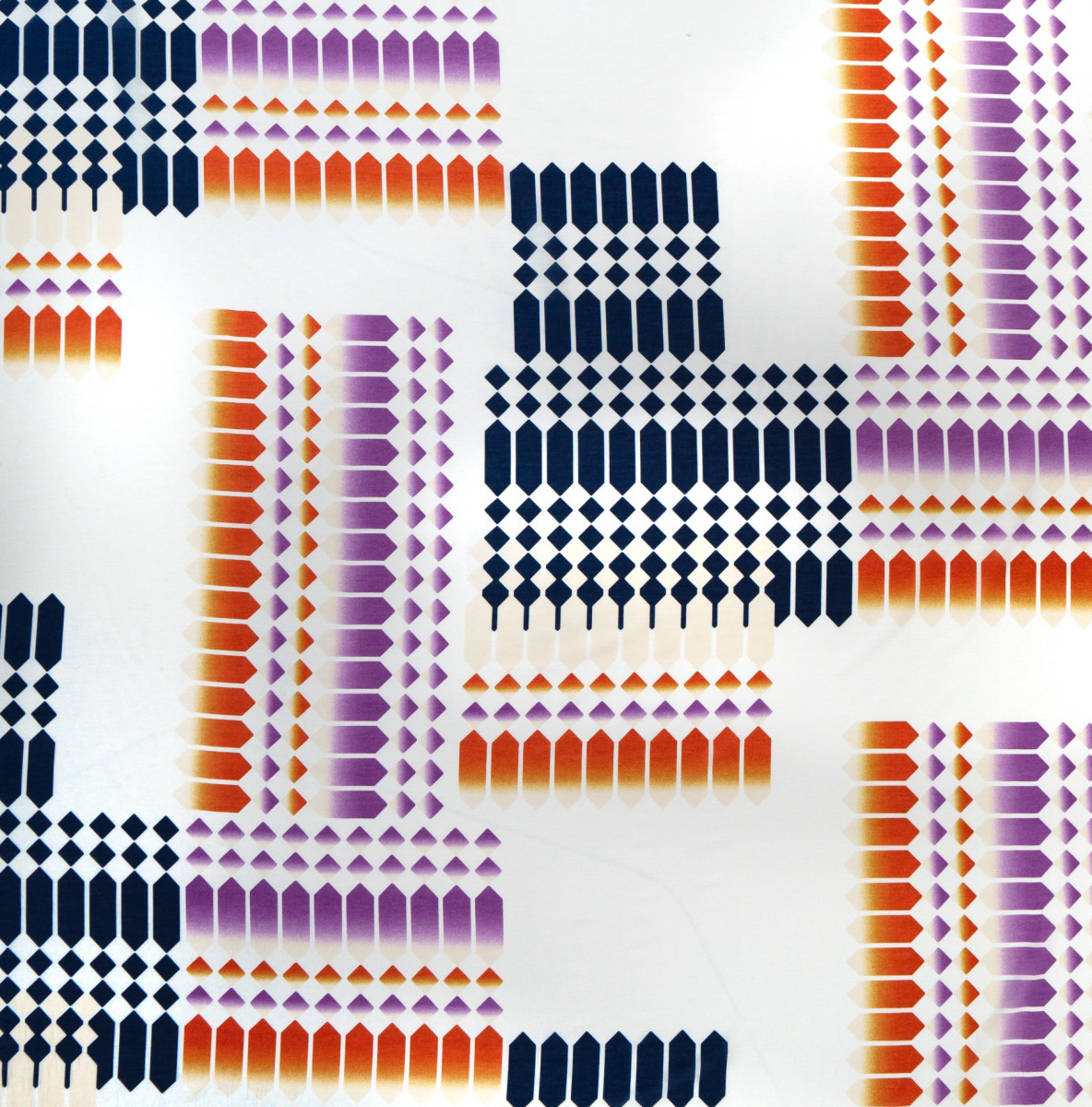 Talianska hodvábna a bavlnená batiste tkanina s farebnými, geometrickými vzormi na krémovom pozadí.