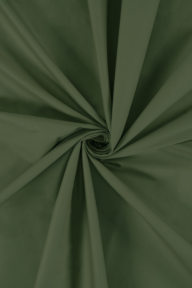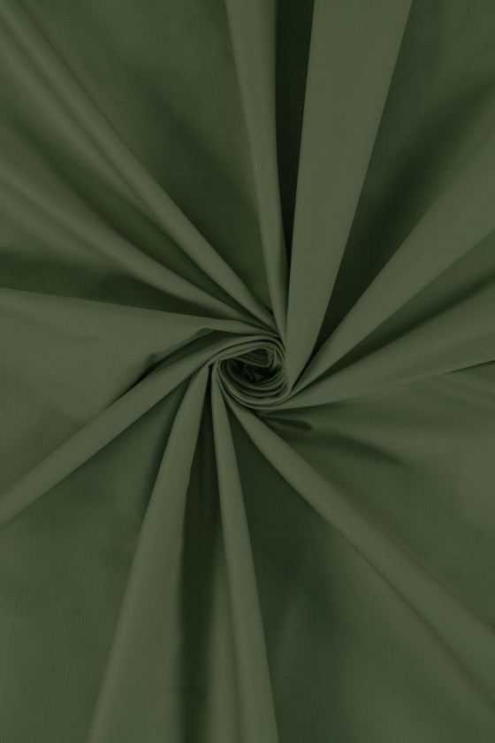 Talianska bavlnená tkanina s prídavkom viskózy a elastanu v khaki/olive. Látka je mierne tuhá, s jemnou saténovou väzbou na jednej strane. Veľmi dobre sa naťahuje, takže je ideálny na šitie vypasovaných šiat, sukne alebo šortiek. Prírodné zloženie z neho robí skvelú tkaninu na jar a leto.