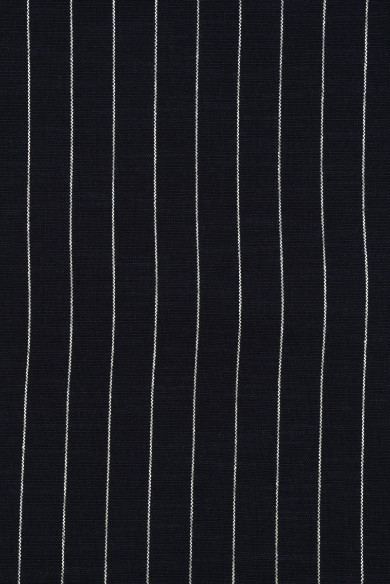 Talianska látka tkaná z bavlny a viskózy s motívom béžových pruhov na tmavomodrom pozadí. Úzke pásy sa umiestňujú pravidelne každé 2 cm. Tkanina s voľnejšou väzbou, pripomínajúca ľan, je mäkká, tenká a neelastická. Skvelý návrh na letné oblečenie, pretože je veľmi priedušný. Dá sa použiť na výrobu blúzok, košieľ, šiat a šortiek.