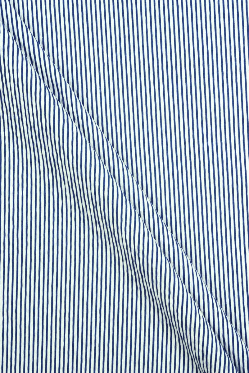 Talianska bavlnená látka s prídavkom polyesteru a elastanu v najmódnejšom pruhovanom vzore tejto sezóny. Vzor je usporiadaný vertikálne v bielej a svetlomodrej farbe, pruhy sú široké 0,2 a 0,4 cm. Látka je mierne elastická so strednou hrúbkou a veľmi zaujímavou, vlnitou (pokrčenou) väzbou určenou na šitie šiat, sukne, košele alebo širokých nohavíc. Prírodná tkanina veľmi dobrej kvality, prídavok polyesteru a elastanu robí pohodlnejšie na používanie a menej sa krčí. Nenahraditeľná látka na jar a v lete.