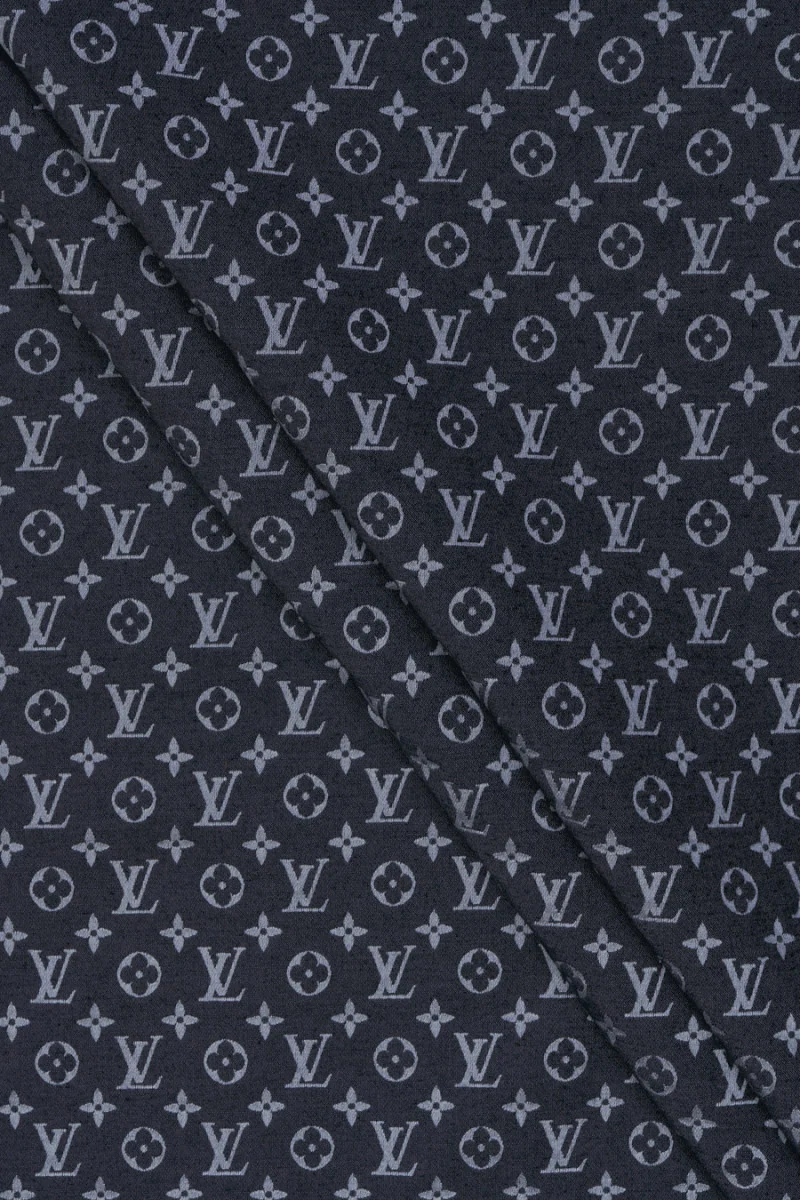 Talianska bavlnená látka, neelastická, tmavomodrá s motívom sivých písmen tvoriacich logo slávneho Fashion House. Písmená sú usporiadané do horizontálnych pruhov širokých 2 cm, oddelených dekoratívnymi pečiatkami typickými pre tohto dizajnéra. Látka je stredne hrubá, je tiež mierne tuhá (pripomína rifle), je ideálna na šitie šiat, sukne alebo tenkého saka. Nevyhnutnosť pre ľudí, ktorí majú radi dizajnérske oblečenie.