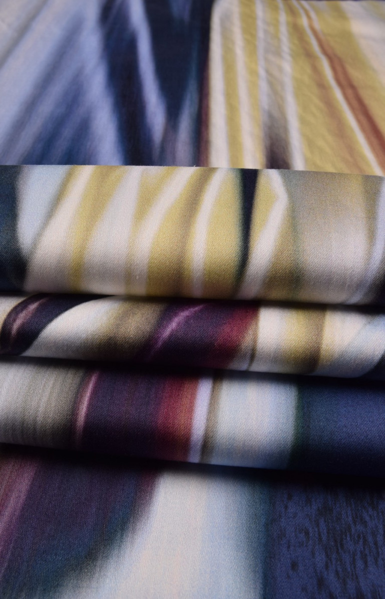 Talianska bavlnená látka s prídavkom elastanu vo veľkosti kupónu 115 cm * 140 cm. Zaujímavý, efektný vzor v odtieňoch modrej, béžovej a bordovej.