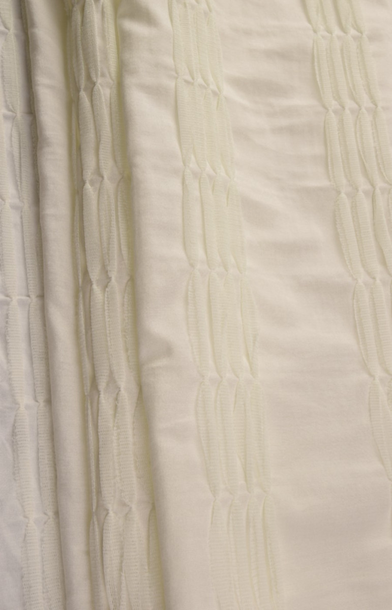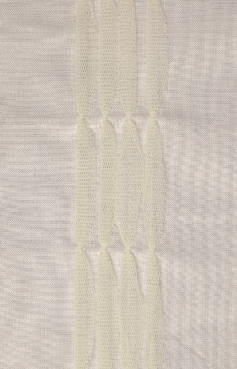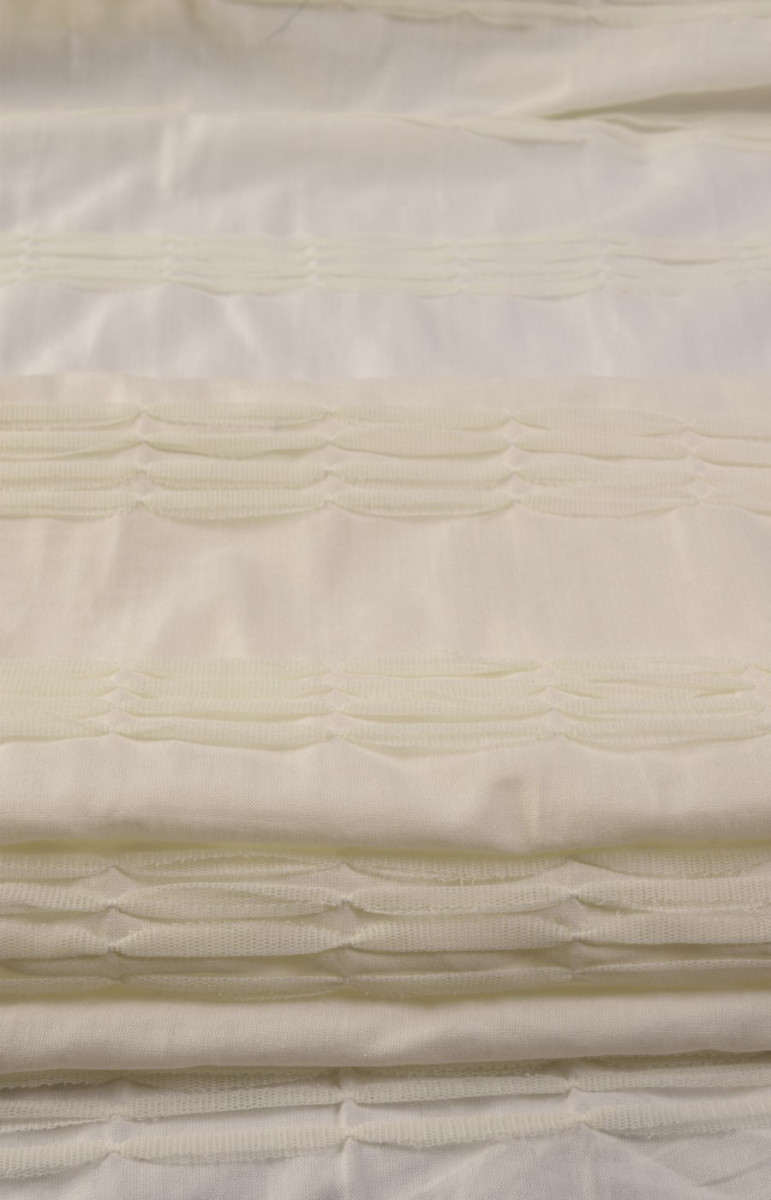 Talianska bavlnená tkanina vo farbe ecru s našitými tylovými stuhami (polyester), ktoré tvoria vodorovné pruhy každých 6 cm so šírkou cca 3 cm