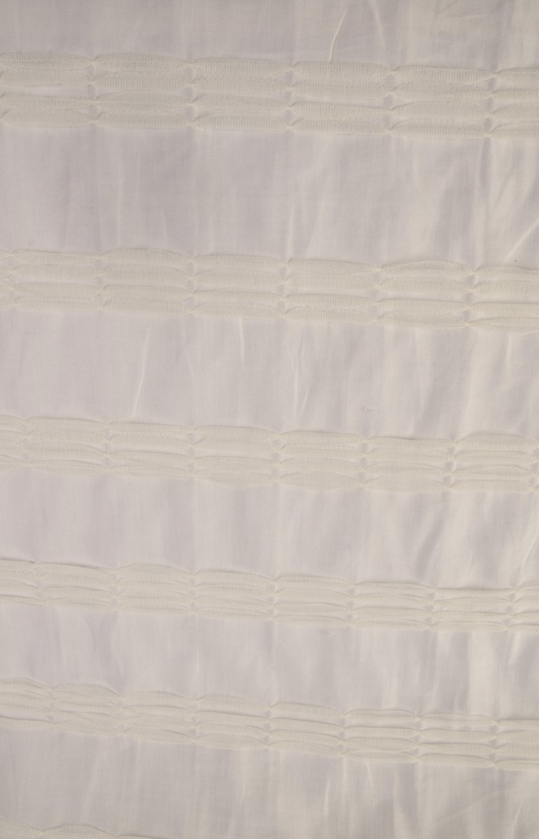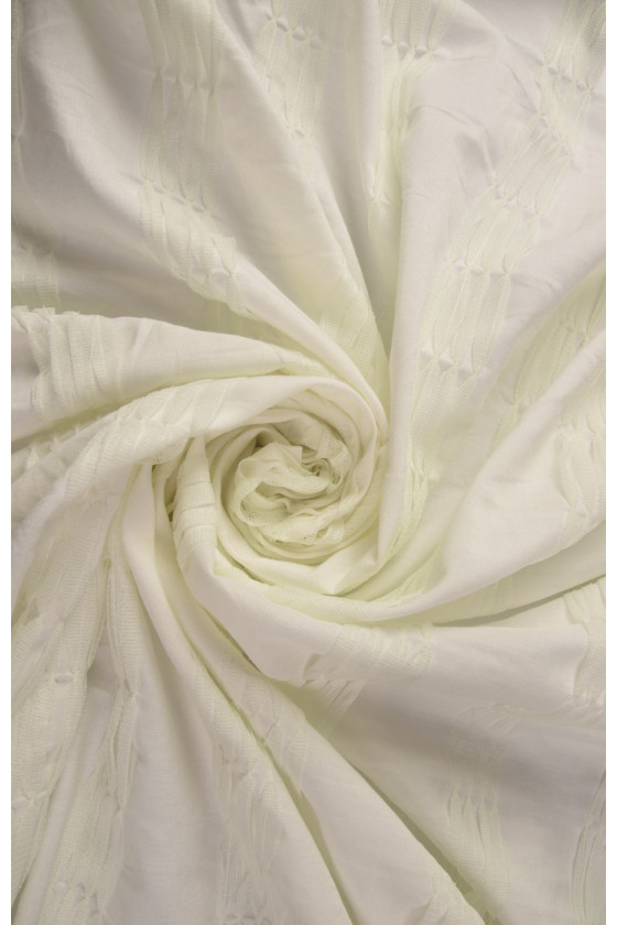 Talianska 100% bavlnená látka vo farbe écru s našitými tylovými stuhami, ktoré tvoria vodorovné pruhy široké asi 3 cm, každých 6 cm. Tenká, mierne priehľadná, neelastická látka - ideálna na šitie letnej blúzky, šiat alebo sukne.