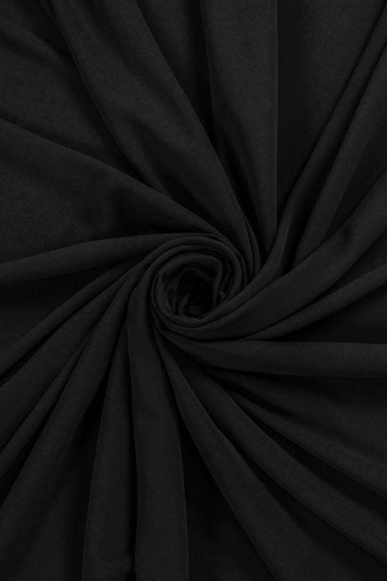 Talianska polyesterová tkanina s prídavkom elastanu v čiernej farbe. Tkanina na šaty Cadi je nepriehľadná, mäsitá, splývavá, matná a elastická. Klasická látka na šaty, tuniky, sukne, nohavice.