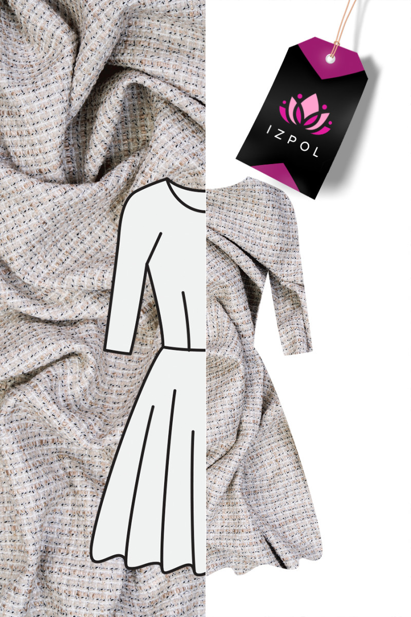 Talianska kostýmová látka chanel vo svetlobéžovej farbe s béžovým a čiernym prešívaním, ktorá vytvára jemný károvaný motív. Látka s mierne vypuklou štruktúrou a pevnou väzbou bola jemne zdobená lesklou lurexovou niťou, ktorá jej dodáva eleganciu. Tkanina je vyrobená hlavne z prírodných vlákien, takže sa veľmi pohodlne nosí a pridaním syntetickej nite je odolnejšia a bez vrások. Fantastický návrh pre fanúšikov tvídového oblečenia v jasných, nadčasových farbách.