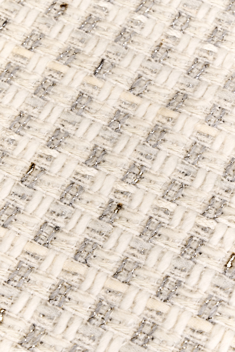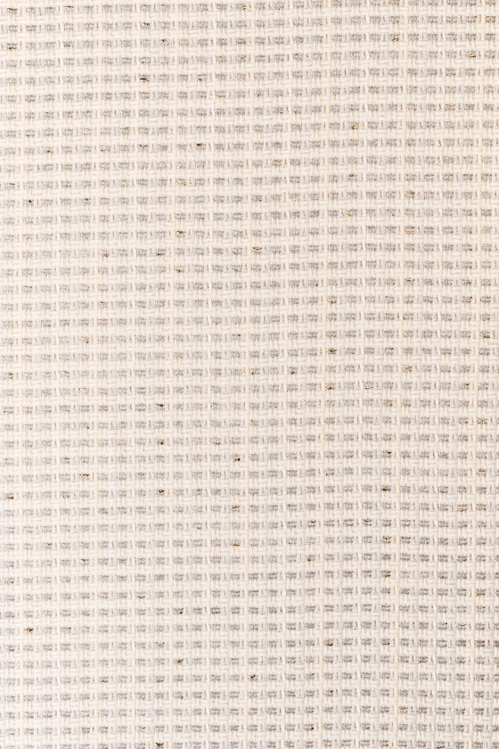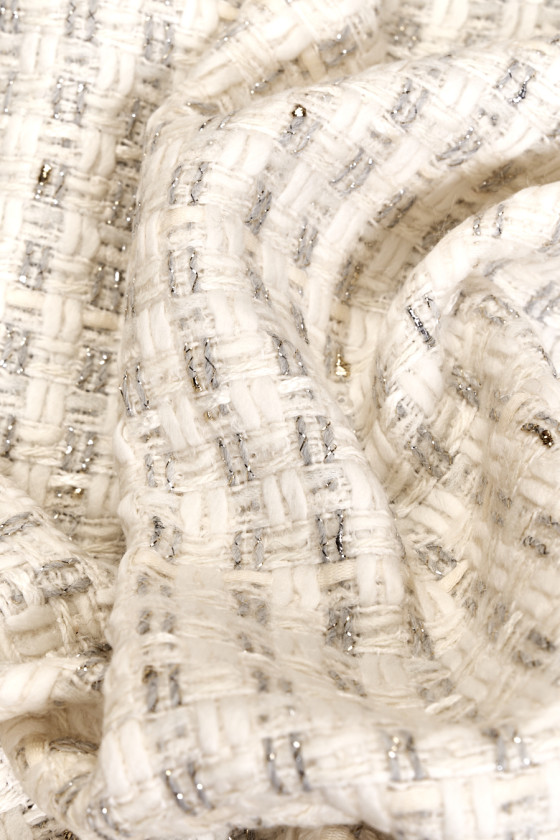 Talianska kostýmová látka chanel v ecru so sivým, horizontálnym prekladaním zdobeným zlatou, lesklou niťou, ktorá jej dodáva eleganciu. Tkanina je vyrobená hlavne z prírodných vlákien, preto je veľmi pohodlná na nosenie, mäkká a neelastická. Fantastický návrh pre fanúšikov tvídového oblečenia vo svetlých, pastelových farbách.