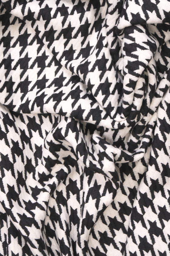 Talianska kostýmová látka chanel so vzorom houndstooth v čiernej a bielej farbe. Tkanina je vyrobená hlavne z prírodných vlákien, takže sa veľmi pohodlne nosí, je mäkká a pridaním syntetickej nite je odolnejšia a nekrčí sa. Návrh pre ľudí, ktorí majú radi klasický, nadčasový dizajn.
