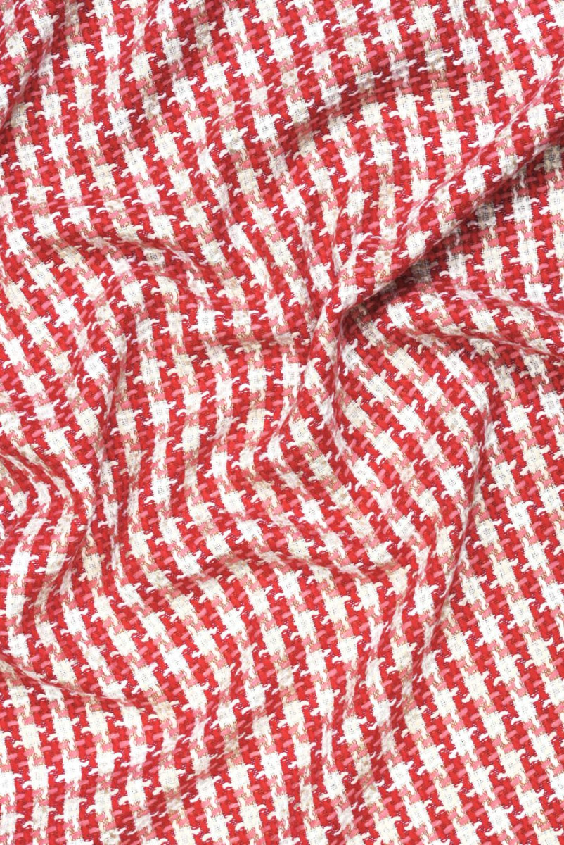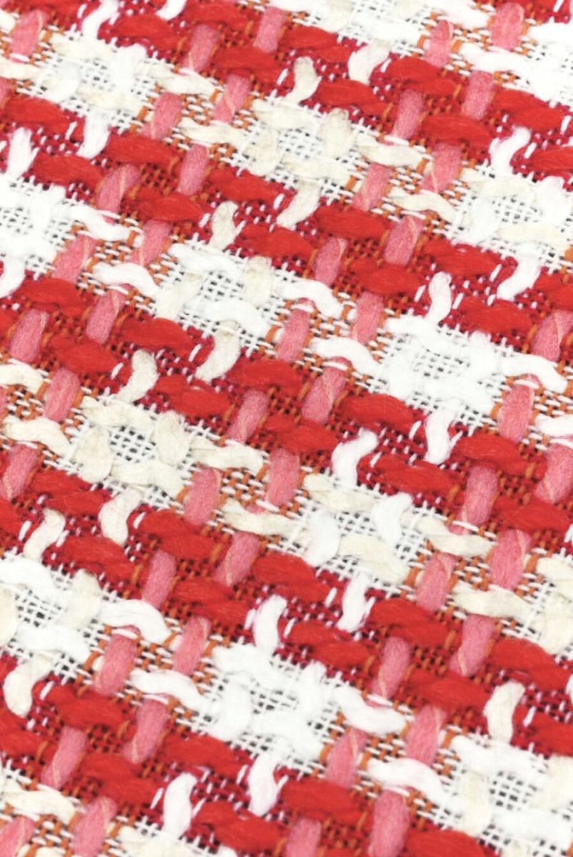 Talianska kostýmová látka chanel v bielej, koralovej, jasne červenej a oranžovej farbe. Látka je mäkká, stredne hrubá neelastická, známa svojou originálnou väzbou. Je ideálny na šitie kostýmu, šiat a tenkého kabáta.