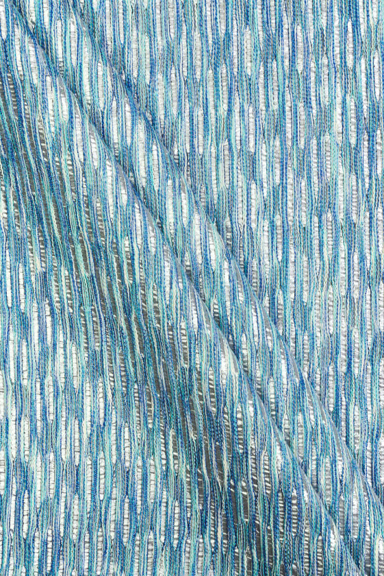 Talianska kostýmová látka chanel vyrobená vo veľmi zaujímavej väzbe, kde nite v odtieňoch modrej a krémovej vytvárajú jemné vlny a medzery medzi nimi sú vyplnené striebornou, lesklou niťou. Látka je neelastická, strednej hrúbky a mierne tuho zakrýva. Vďaka vysokému obsahu bavlny sa materiál príjemne drží, čo sa premieta aj do pohodlia pri nosení. Skvelá ponuka pre ľudí, ktorí hľadajú zaujímavý dizajn látok. Môže byť použitý na šitie kostýmov, búnd, sukní alebo šiat.