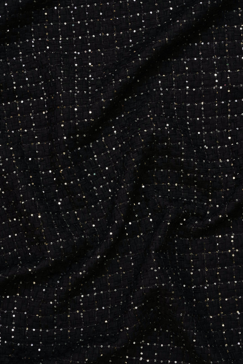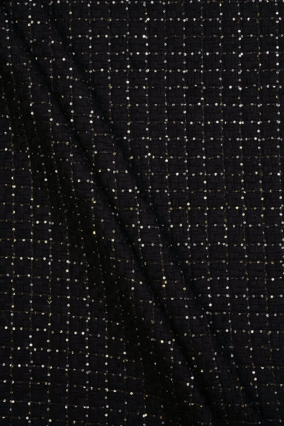 Talianska látka chanel v čiernej farbe zdobená malými striebornými flitrami. Flitre a lesklá jedna čierna niť vytvárajú vzor malého, pravidelného šeku, kde jeden šek je 1,5 cm * 1,5 cm. Celok je vyrobený v košíkovej väzbe z matnej čiernej nite vo forme stuhy. Látka je mäkká, ľahká, neelastická, tenká, ale nepriehľadná, veľmi dobre sa hodí k jarným outfitom. Dá sa použiť na výrobu kostýmov, šiat, sukní alebo búnd.