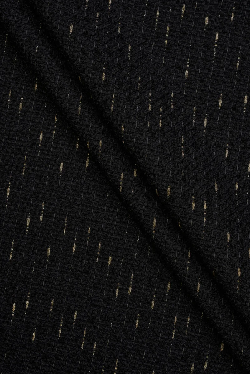 Chanel látka v čiernej farbe so zlatou lesklou niťou, ktorá vytvára malé čiary. Látka má jemnú, vypuklú štruktúru, ktorá pripomína bucle. Materiál je mäkký, neelastický, s mierne voľným tkaním – vyžaduje podšívku. Odporúčame ho na kostýmy, šaty, sukne alebo bundy.