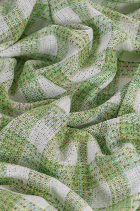 Kockovaná kockovaná kostýmová látka chanel v bielej a svetlozelenej farbe s ružovým a modrým akcentom, určená pre tenké sukne alebo šaty. Materiál je voľne tkaný zo 100% viskózy, preto je priedušný a priedušný.