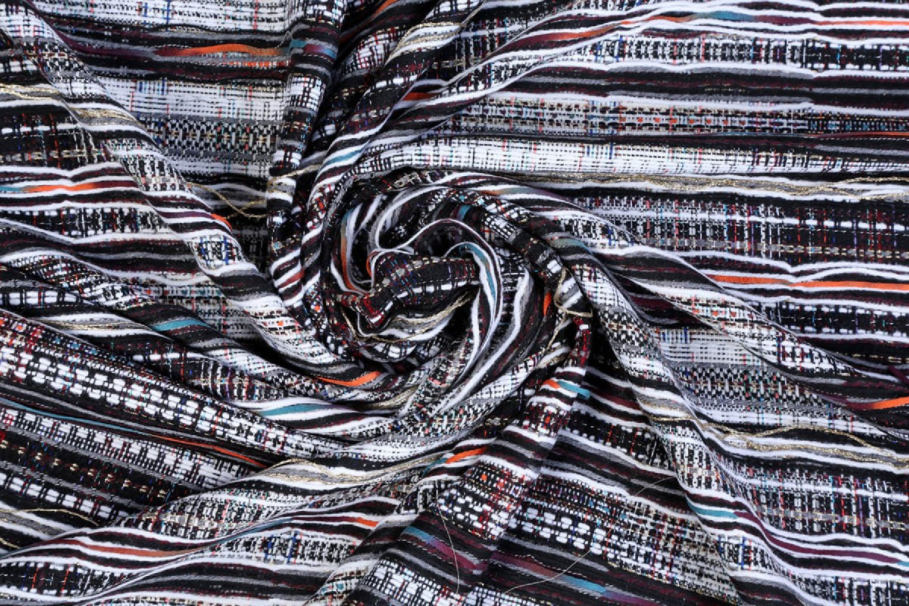 Krásny, pôvodne tkaný žakár zo zmesi vlákien. Vlákna, ktoré môžete vidieť na priložených fotografiách, je možné vystrihnúť, aby sa vytvoril efekt strapcov. Táto krásna látka sa dá použiť na šitie kostýmov, šiat, búnd a kabátov.