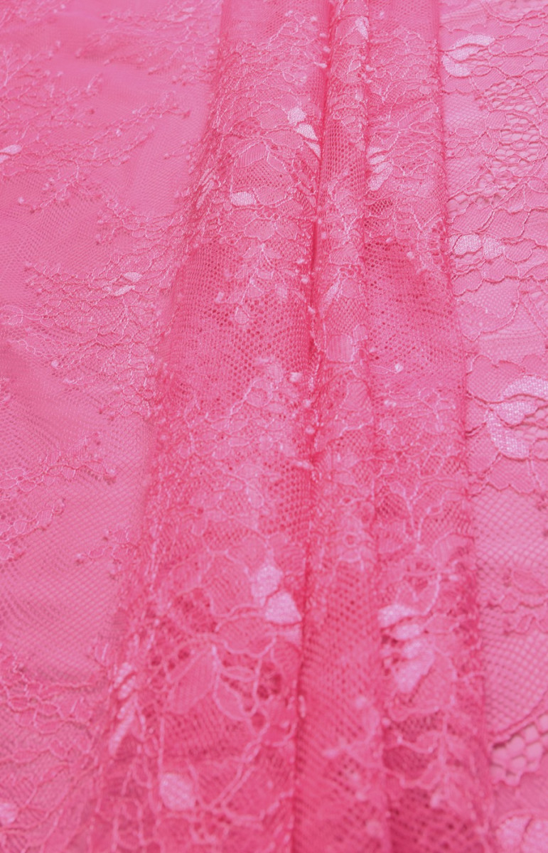 Jemná francúzska čipka v ružovej farbe, široká 70 cm. Čipka je mäkká, príjemná na dotyk, pekne sedí. Odporúčame k blúzkam, vložkám, elegantnému spodnému prádlu.