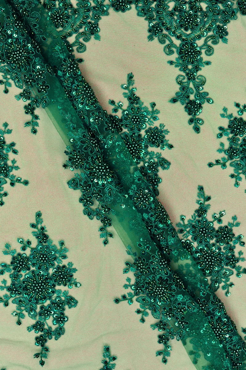 Talianska čipkovaná večerná látka v tmavozelenej farbe, vyrobená z tylu v rovnakej farbe s rovnomerne vyšívanými kvetinovými motívmi s rozmermi 10 cm*20 cm. Je bohato zdobený zelenými flitrami, korálkami a perlami a zdobený zelenou šnúrkou, vďaka ktorej je vzor mierne konvexný. Okraje látky sú ukončené širokým, ozdobným zubom - šijeme ho po obvode.