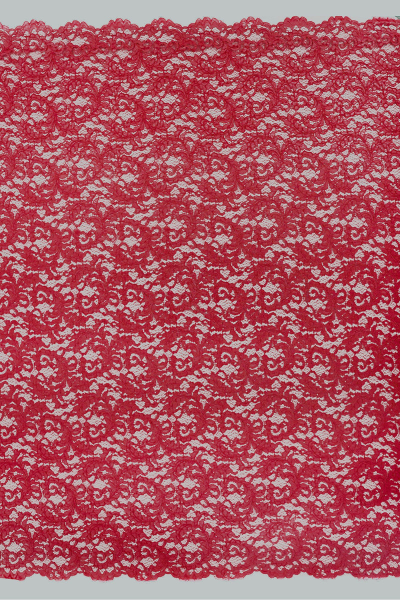 Talianska čipka v tmavočervenej farbe. Látka má hustý kvetinový motív spojený sieťovinou a zakončený šnúrou. Korunka je z oboch strán zakončená ozdobným zubom - šijeme ju po obvode. Veľmi pekná ponuka pre ľudí, ktorí majú radi klasické farby.