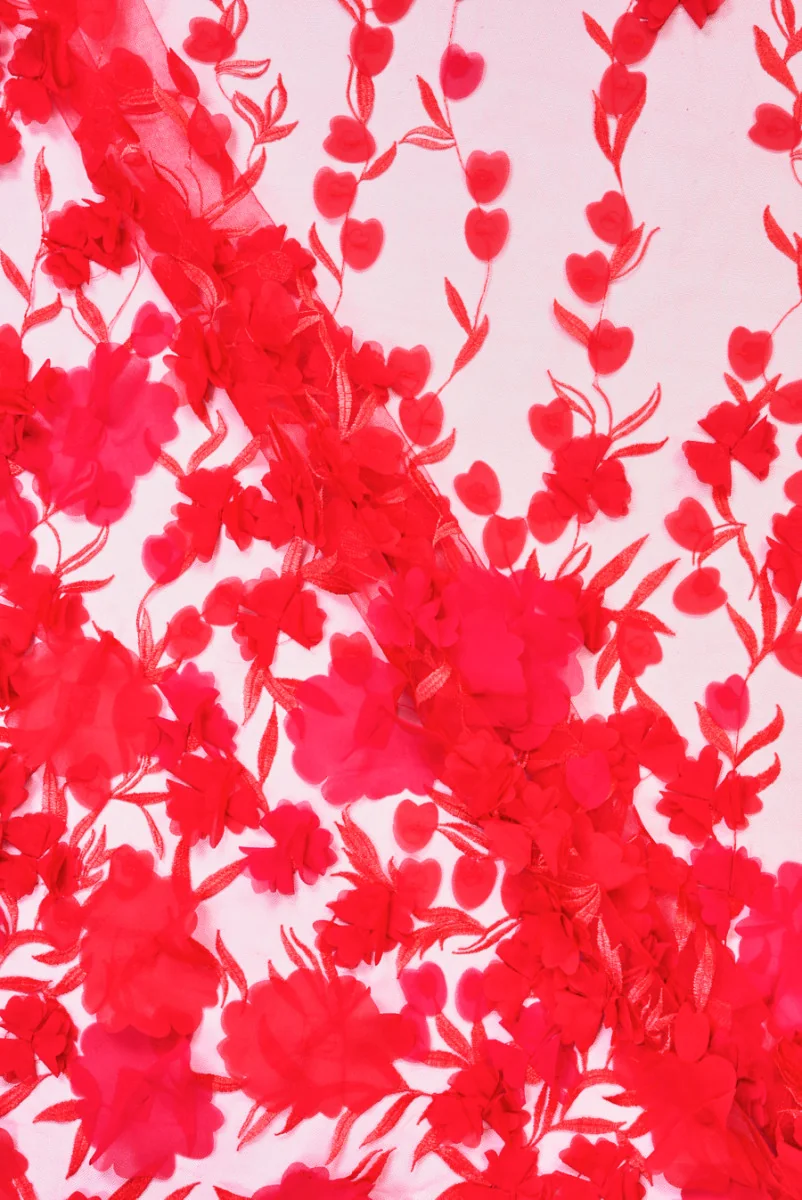 Talianska večerná látka v červenej farbe. Na elastickej sieťovine sú vyšívané listy a vetvičky, na ktoré sú našité kvety šifónu v červenej farbe. Celý vzor sa smerom k jednému okraju látky zahusťuje, kvety mierne "trčia" a vytvárajú 3D efekt - šijeme ho po obvode. Krásna ponuka pre ľudí, ktorí majú radi originálne látky, bude ideálna na šaty a sukne.
