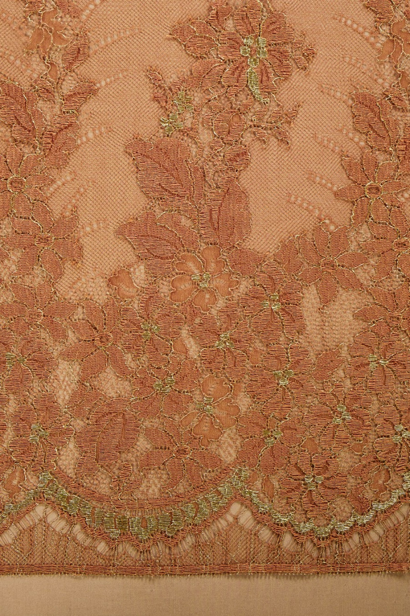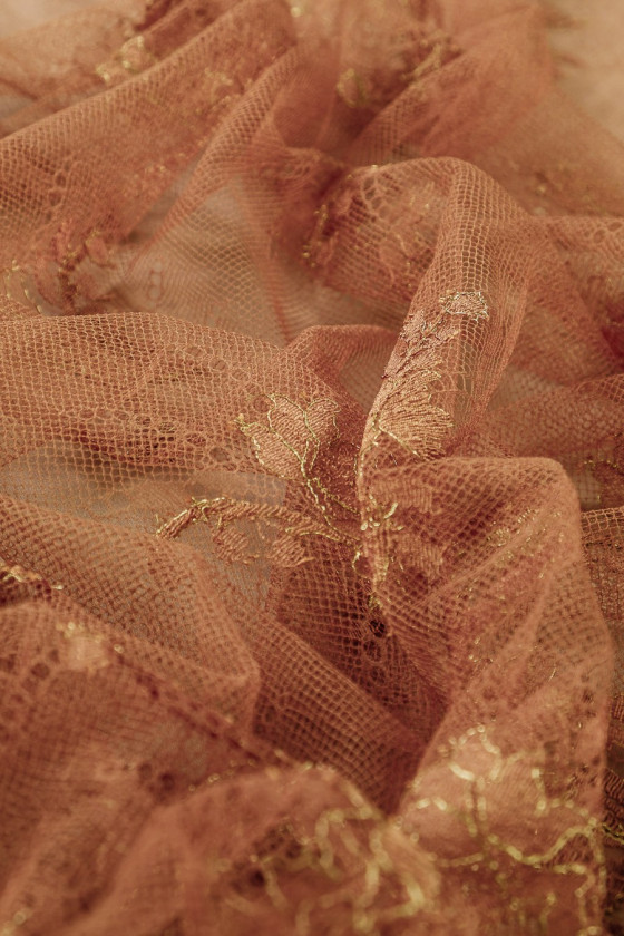 Krásna červená čipka so zlatou lurexovou niťou. Tkanina je z oboch strán ukončená asymetrickým zubom (na samorezanie). Vzor sa vyskytuje periférne. Čipka je široká 95 cm.