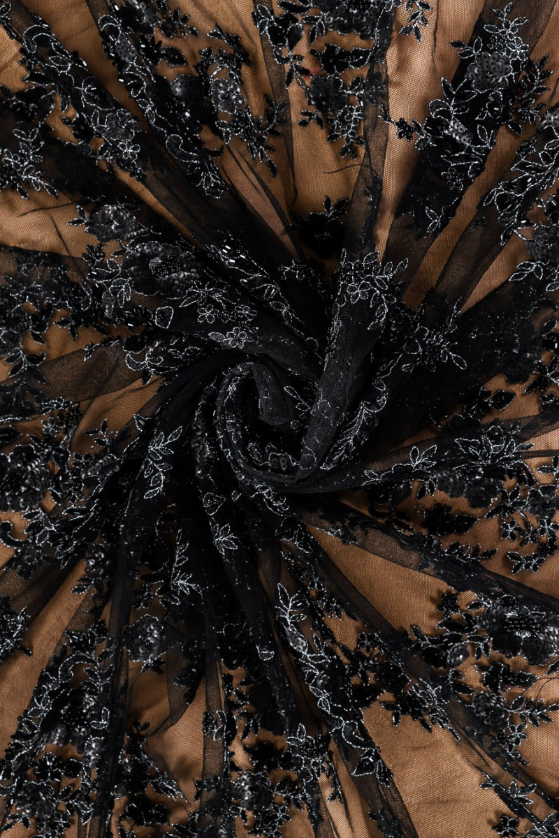 Krásna čierna čipka vyšívaná flitrami a korálkami a zdobená striebornou lurexovou niťou. Dokončené zubom na oboch stranách. Ideálne na večerné šaty.