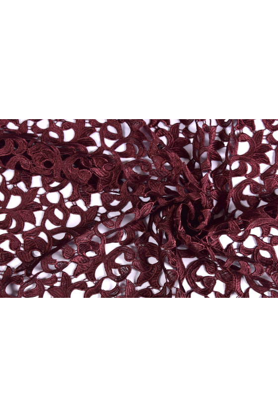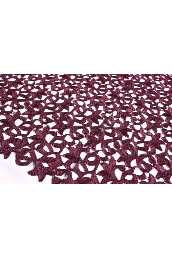 Talianska guipure tkanina v bordovej farbe v kupónoch s rozmermi 70 cm* 120 cm a 90 cm* 120 cm. Krásny, hustý kvetinový vzor s mierne lesklým povrchom, látka je na oboch stranách dokončená malým ozdobným zubom. Látka je ideálna pre ľudí, ktorí majú radi elegantné, tmavé farby. Je ideálny na šitie elegantných šiat, blúzky, sukne alebo ako zavŕšenie iných látok.