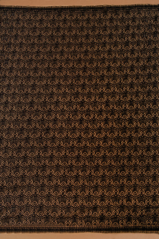 Čipka je široká 150 cm. Kombinácia čiernych viskózových a lurexových nití. To dáva efekt lesklej tkaniny. Odporúčané použitie: dlhé šaty alebo blúzky.