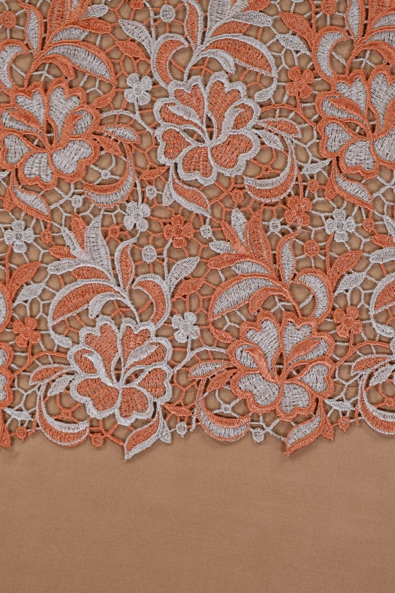 Guipure čipka v oranžovo-šedej farbe, tkaná z viskózových a polyamidových nití. Pre krásny efekt odporúčame zvoliť podšívku, napr. z hodvábneho saténu.