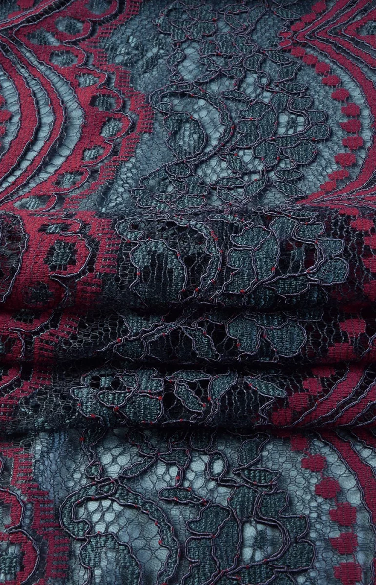 Francúzska čipka tkaná z bordových a zelených nití. Celok vytvára kompozíciu pruhov-vĺn širokých asi 15 cm.