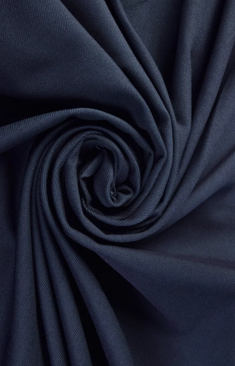 Hrubšia bavlna s prímesou polyesteru a elastanu v grosgrain väzbe. Látka funguje dobre na vlákna a dá sa použiť na šitie vypasovaného oblečenia. Farba: klasická námornícka modrá.