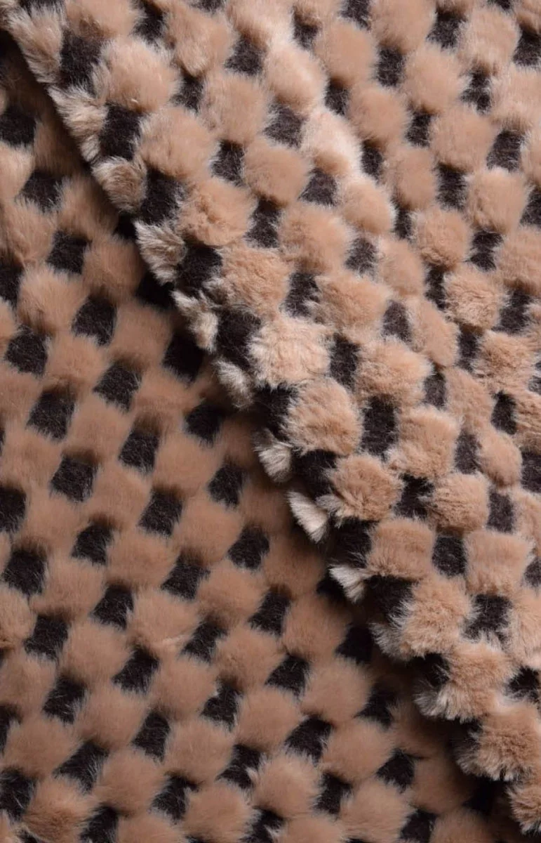 Hustá béžovo-hnedá eko kožušina na kabáty alebo bundy. Vlasy sú dlhé asi 0,5 cm.